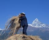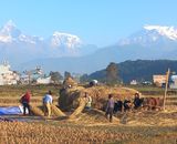 कास्कीको पोखरा महानगरपालिका–१७ बिरुवा फाँटमा शनिबार परम्परागत रुपमा गोरुले धानको दाइँ गर्दै किसान र पृष्ठभूमिमा माछापुच्छ्रे हिमश्रृंखलालगायतको दृश्य। सिँचाइको सुविधा भएको यो फाँटमा धान मध्येको अब्...