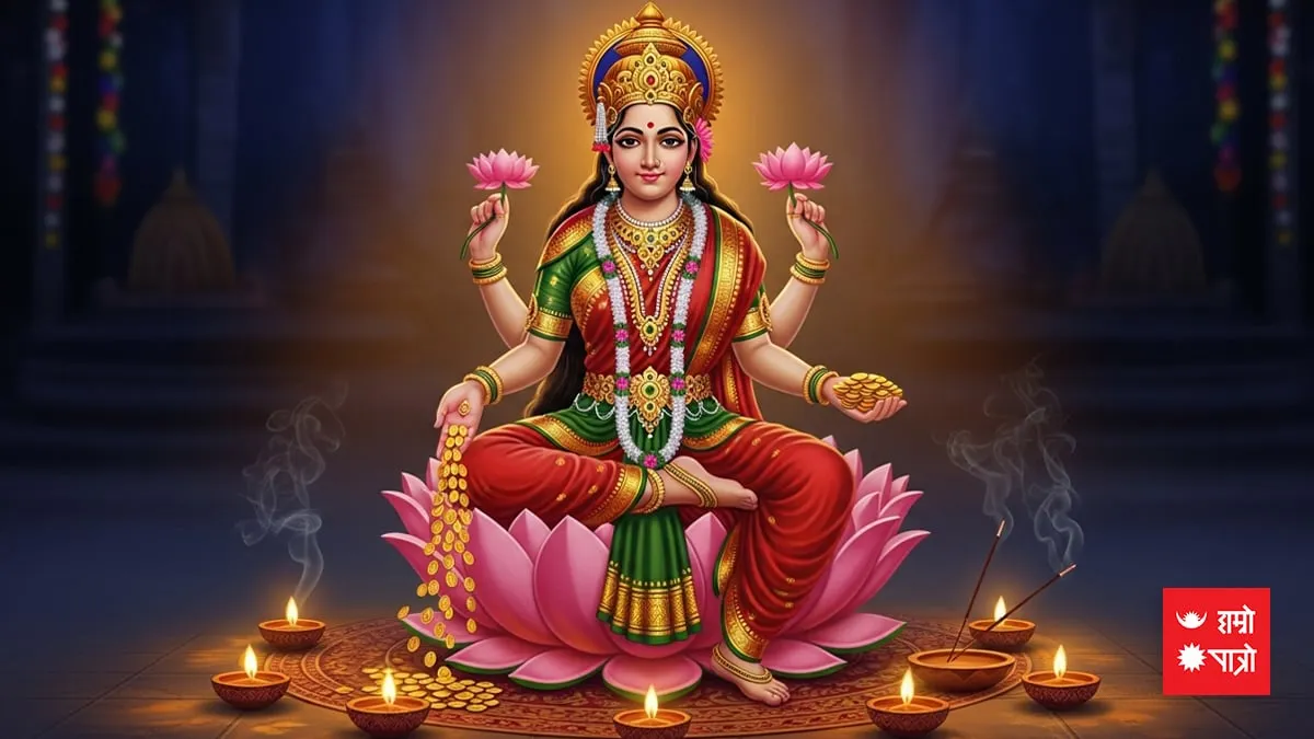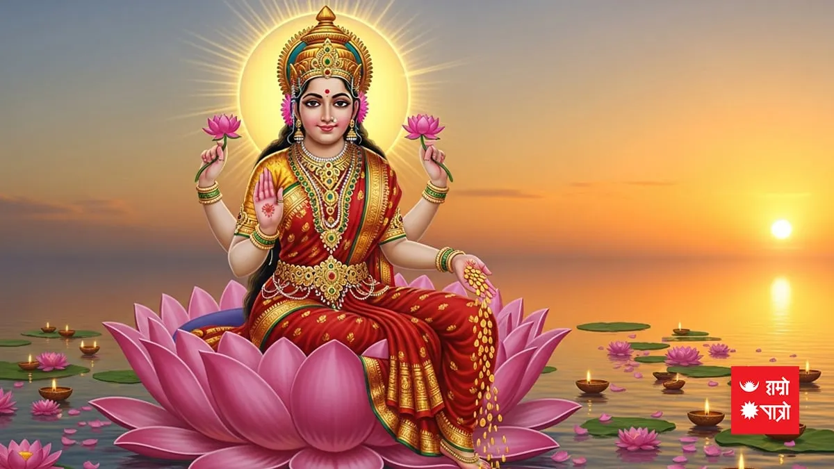 कमलमा विराजमान श्रीहृश्री जस्ता बीज मन्त्रले आशीर्वाद दिनुहुने महालक्ष्मी माताको जय, वहाँ माताको याद मात्र गर्नाले सबै प्रकारको प्रसाद र आशीर्वाद प्राप्त हुन्छ।