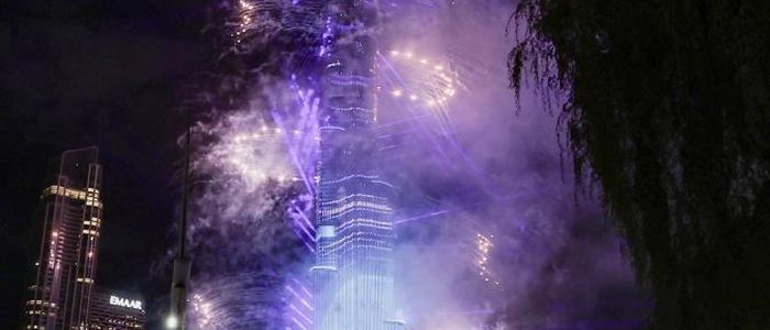 दुबईस्थित संसारकै अग्लो भवन 'बुर्ज खलिफा'मा रङ्गीचङ्गी बत्ती, सङ्गीत र पानीको फोहराको मनमोहक संयोजनपछि कलात्मक आतसबाजी गरियो।