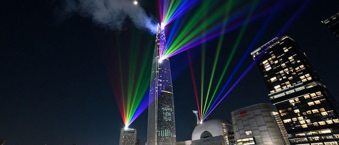सोलस्थित दक्षिण कोरियाको सबैभन्दा अग्लो भवन 'लोट्टे वर्ल्ड टावर'माथिको आकाशमा लेजर लाइटबाट रङ्गीचङ्गी प्रकाश प्रक्षेपण गरियो।