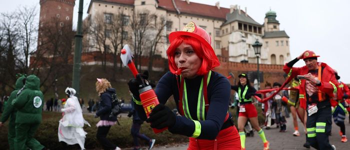 पोल्यान्डको क्र्याकोमा नयाँवर्षका अवसरमा आयोजित दौड प्रतियोगितामा धावकहरू चिसोलाई बेवास्ता गर्दै विभिन्न खालका पोसाक लगाएर सहभागी भए।