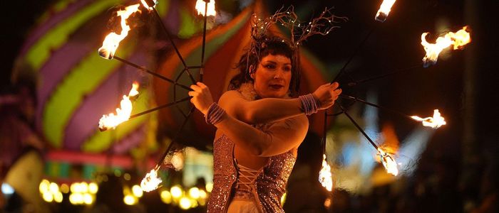 डब्लिन कासलमा आयोजित म्याटिनी काउन्टडाउन कन्सर्टमा सहभागी हुन जानुअघि सडकमा एक कलाकारले आगो घुमाउँदै आफ्नो नृत्य प्रस्तुत गरिन्।