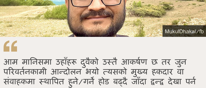 "तर आम मानिसमा उहाँहरू दुवैको उस्तै क्रेज छ। तर उहाँहरूप्रति आकर्षित समाज र तप्का भिन्न छ," ढकाल भन्छन्, "त्यसलाई मिलाएर लग्न सक्दासम्म देशको हित हुनेछ। तर जुन परिवर्तनकामी आन्दोलन भयो त्यसको मुख्य हकदार वा संवाहकमा स्थापित हुने वा गर्ने होड बढ्दै जाँदा द्वन्द्व देखा पर्न सक्छ।"