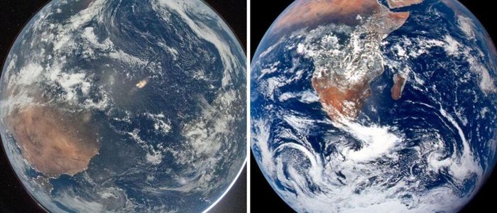 सो फोटोमा पृथ्वी उल्टो जस्तो देखिन्छ जसमा पश्चिम सहारा र आइबेरियन प्रायद्वीप बायाँपट्टि देखिन्छ भने दक्षिण अमेरिकाको पूर्वी भाग दायाँपट्टि देखिन्छ।