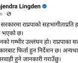 हेटौंडा- राष्ट्रिय प्रजातन्त्र पार्टी (राप्रपा) का अध्यक्ष राजेन्द्र लिङ्देनले मधेस प्रदेश सरकारमा रहेको राप्रपाको सहभागिता तत्काल फिर्ता लिन निर्देशन दिएका छन् । अध्यक्ष लिङ्देनले आज सामाजिक सञ्ज...