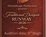 काठमाडौं– आगामी फागुनमा काठमाडौंमा आयोजना हुने पहिलो सीजनको ‘ट्रेडिसनल डिजाइनर रनवे–२०२६’ को अडिसन मिति घोषणा गरिएको छ । आयोजक संस्था ड्रिमस्केप प्रोडक्सनले जनाए अनुसार यही माघ ३ गते शनिवार ‘ट्रेडि...